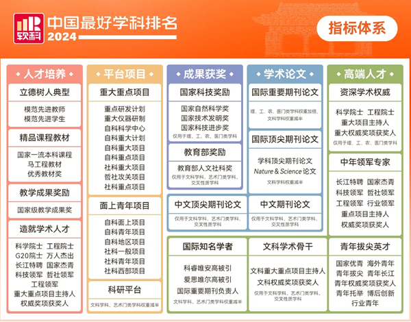 据悉,“2024软科中国最好学科排名”指标体系涵盖了人才培养、平台项目、成果获奖、学术论文、高端人才等5个维度,下设18个具体指标,共计70余项测量指标,全方位、多维度地评估了各学科的综合竞争力。排名榜单包括94个一级学科,共有486所高校的4924个一级学科上榜。