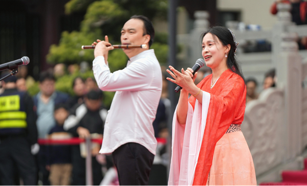 紧接着,毛云岗教授的竹笛与陆娟华老师的湖州方言蚕歌联唱《清明赞蚕花》,在悠扬的歌声中,身着纱衣的姑娘们手持花篮,向观众席抛洒蚕花和糖果,重现了“轧蚕花”古俗的喜庆氛围,将千年蚕俗的灵动韵律推向高潮。