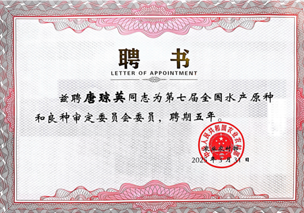 会议宣布了第七届全国水产原种和良种审定委员会委员、第七届全国水产原种和良种审定委员会顾问委员会和青年工作组组成人员名单。我校生命科学学院水产系罗氏沼虾遗传育种团队带头人、原国家虾蟹产业技术体系罗氏沼虾种质资源与品种改良岗位科学家杨国梁研究员当选为顾问委员会委员,团队骨干唐琼英研究员当选为审定委员会委员,团队青年骨干、现国家虾蟹产业技术体系罗氏沼虾种质资源与品种改良岗位科学家易少奎教授当选为青年工作组成员。